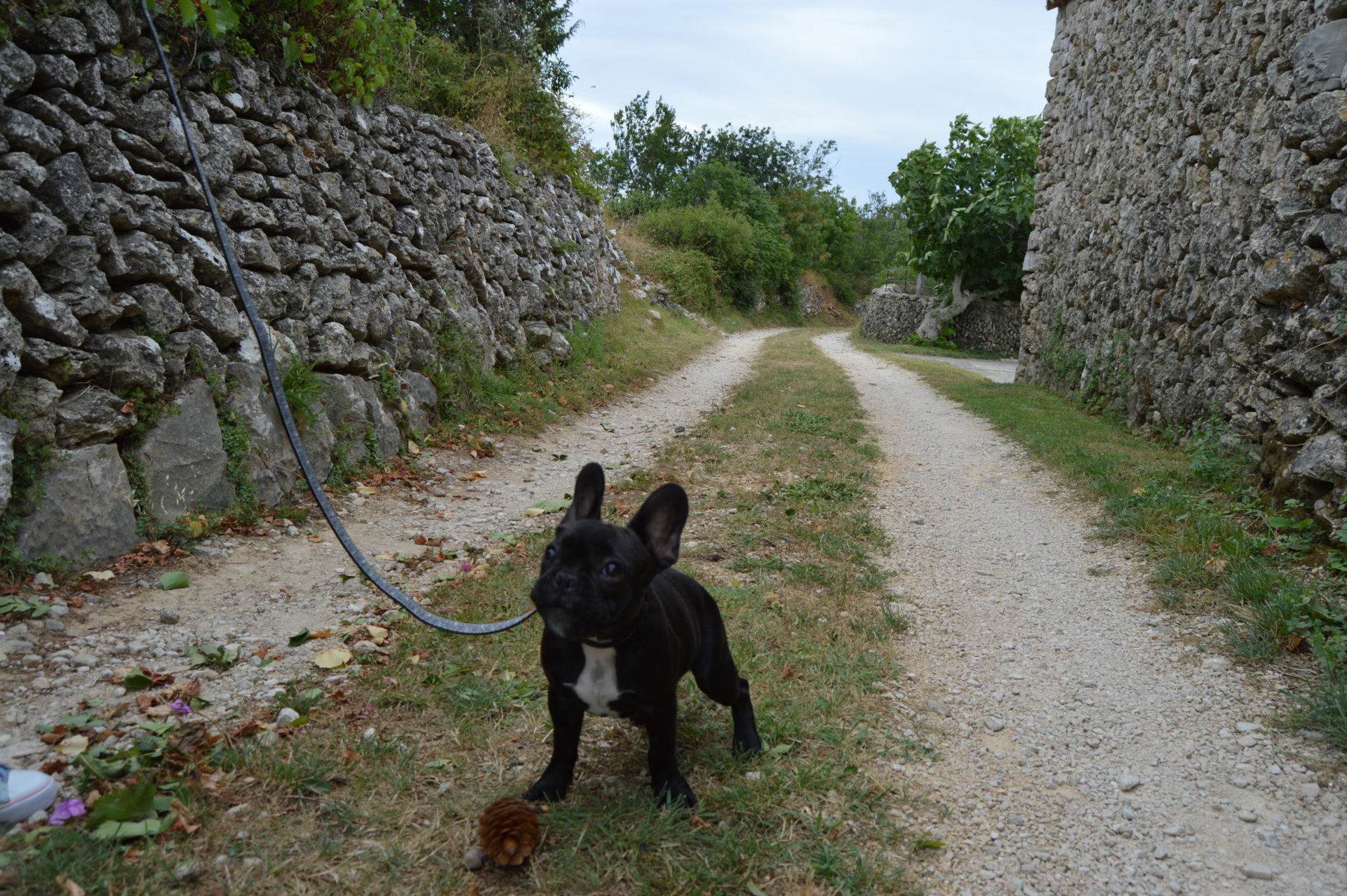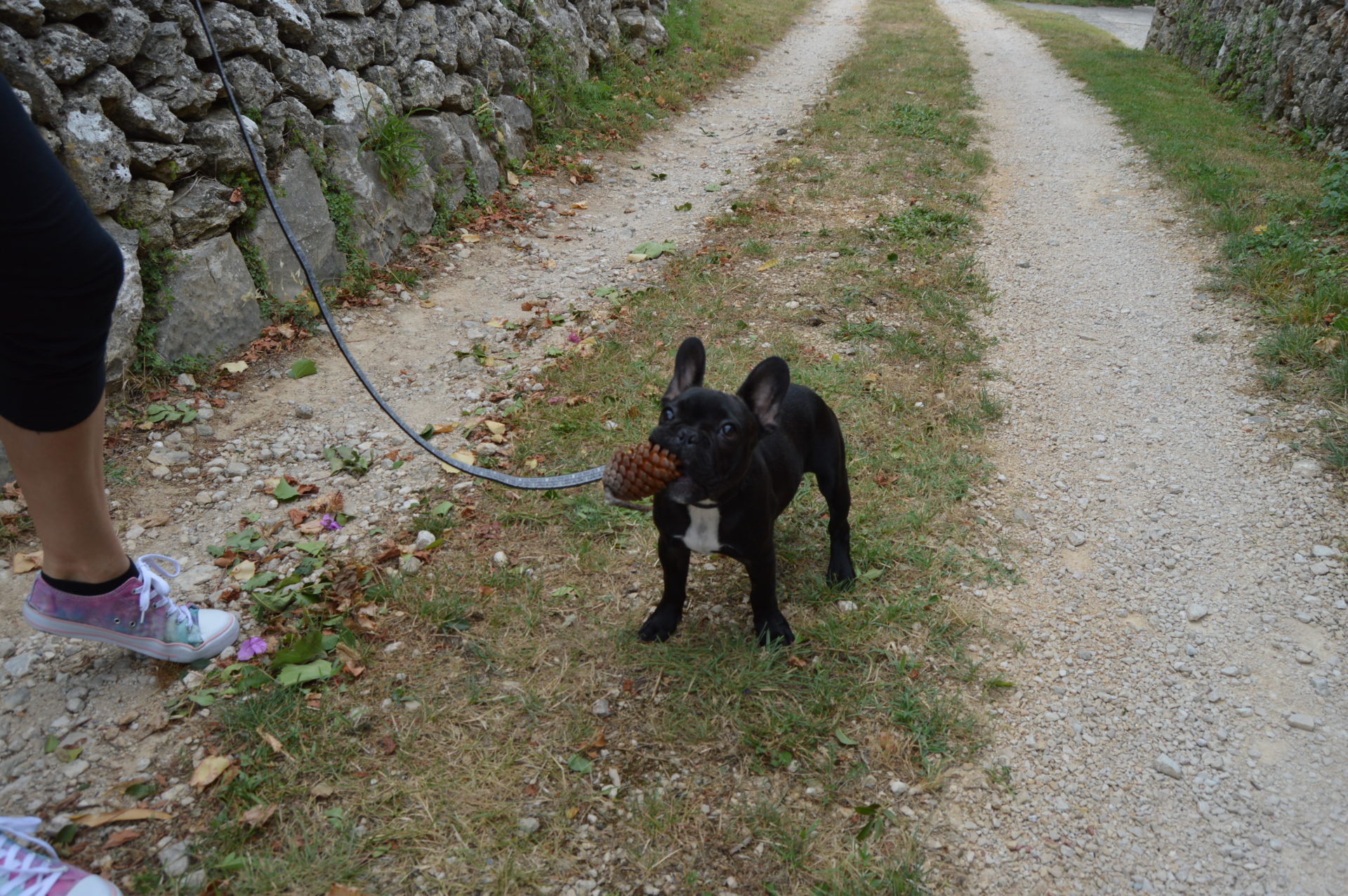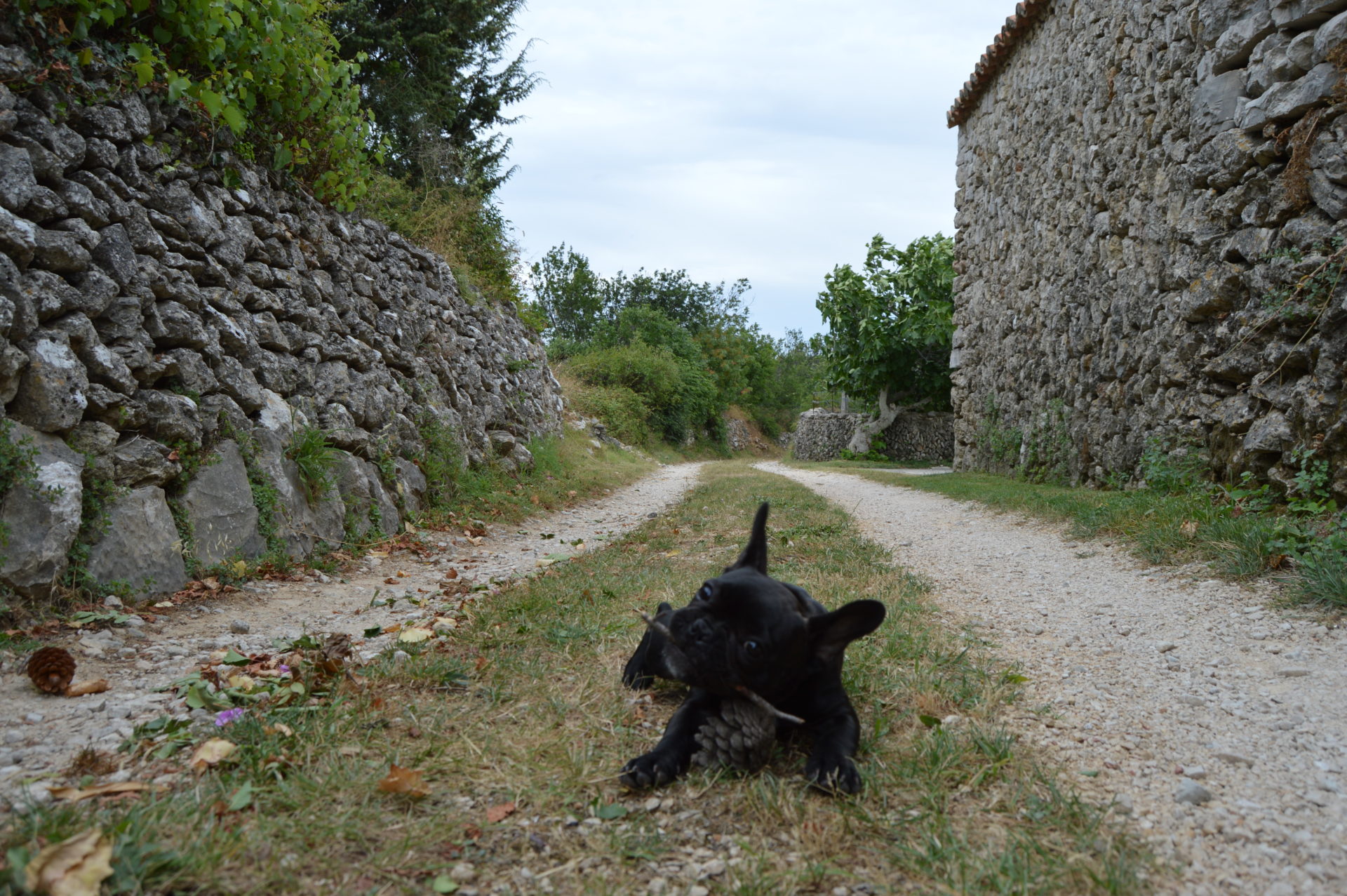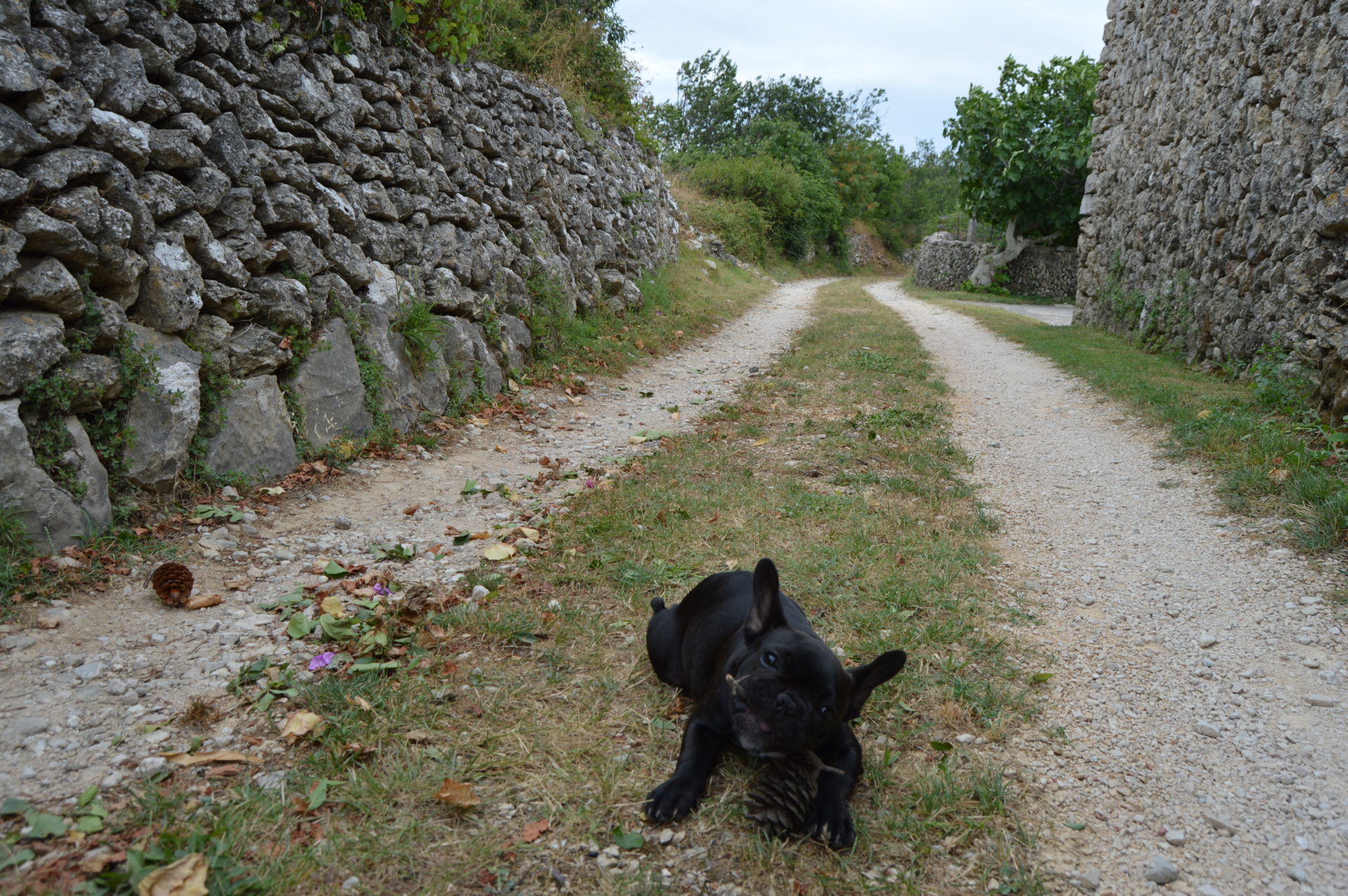 We extended today’s walk a bit and went to explore the island. We didn’t find a whole lot, but since I can’t legally (without the girl screaming like a lunatic) hunt insects I found another pastime activity. I hunt pinecones. There’s plenty of them all around and all sorts and sizes. So I jump on them, chew on them or just kick them and run after them. The latter activity is sometimes joined by the other two bipeds and then we are all kicking them around and there is dust everywhere and I am running through it. Then I steal the cone from them and run away with it, since they don’t know when to leave me alone and I want to chew it in peace.