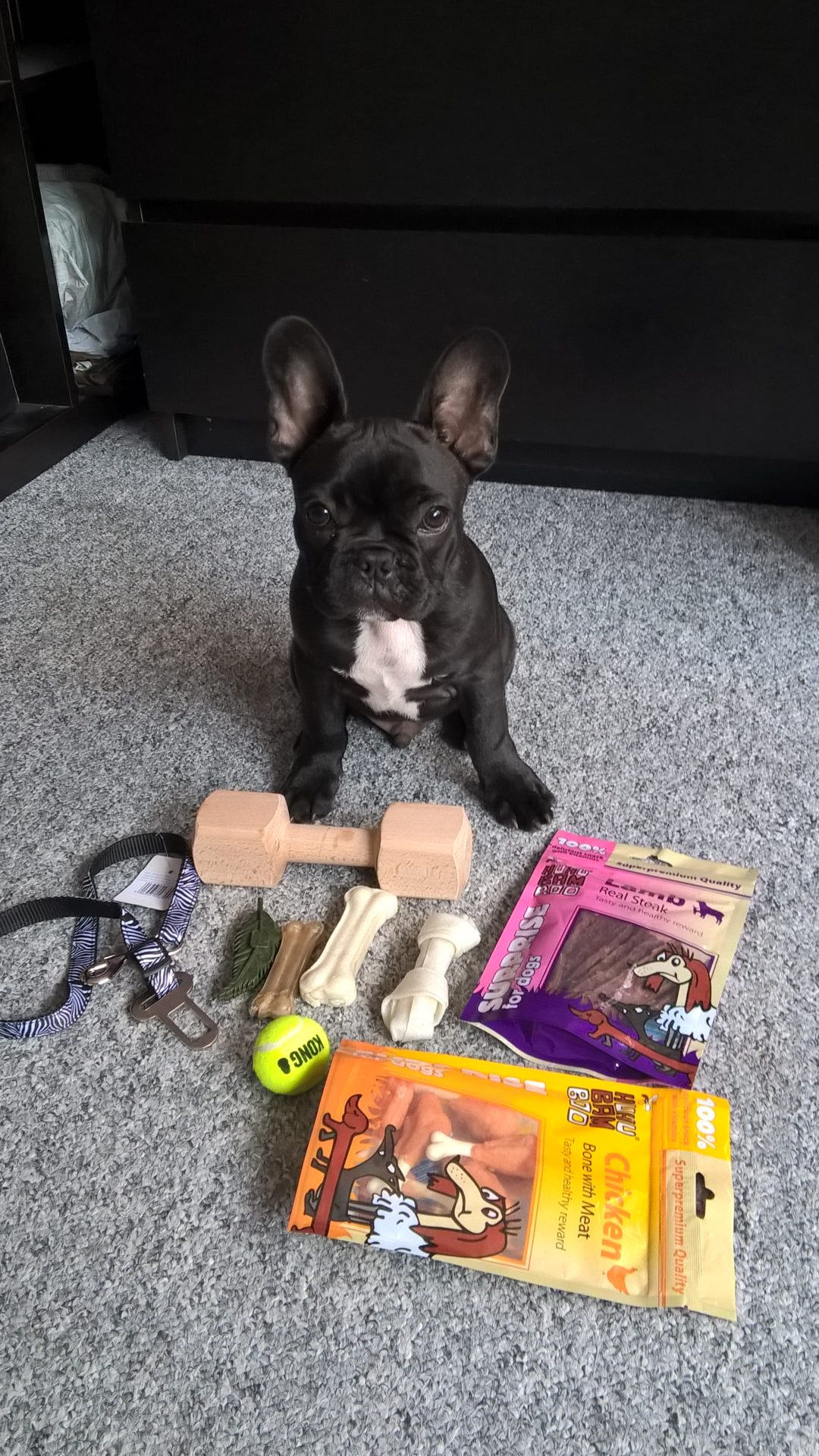 After leaving the clinic and coming out… it is raining. Disgusting cold weather, yak. I wanted to hide myself in the bag and get carried but then I couldn’t see outside so female master had to cover my head with her shirt. It was so cool of her. She tried to complain about her cold back but I made cute eyes so she didn’t say anything. I mean she wanted a dog, and I want to have a nice view when we are outside. On the way home we also stopped by at the pet shop and she bought me three small treats. One for being big boy, second one for being a hero (the nails thing) and third one for being an actress (again nails…). I still wanted the small ball to clean my teeth with but they only had big ones. I couldn’t fit those into my mouth (or so said the saleswoman, I’m sure it would fit, I’m chewing on bigger things at home), so I may get smaller one next time. But I managed to snag this small “tennis ball” that fits perfectly (tested) and it even squeaks. My masters don’t really share my joy when I play with the squeaky toys, I don’t understand. They are cool (the toys that is).