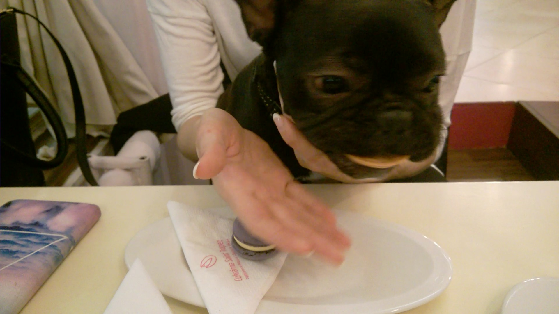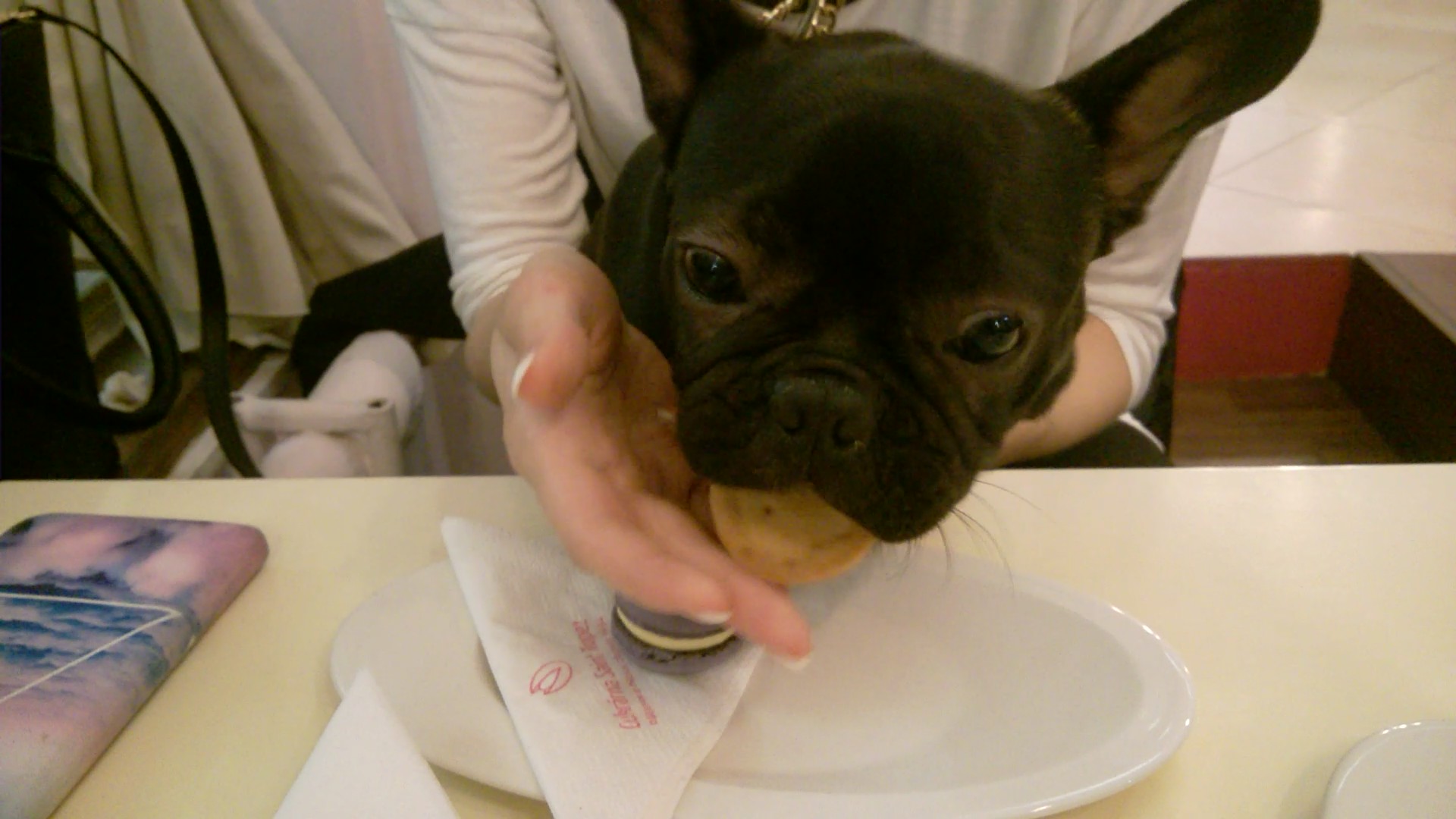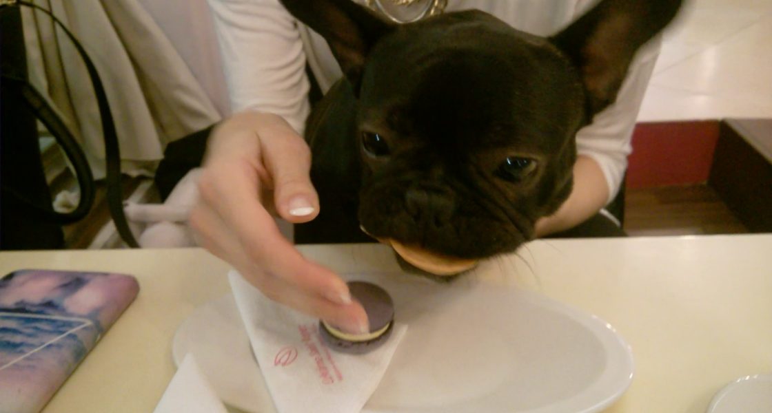 While the bipeds got brought the cupcakes, I was rolling under the table and then the girl got an idea, as if I could get something too, so she jumped to get me a macaroon and the nice man brought me a special cookie, because I am just cute and everyone likes me. Both were delicious without question, only the cakes wouldn’t be allowed to taste, they said I’d be fat and other mean things. The gentleman saw what a bunch of cheap bipeds I have and he brought me another cookie. Yummy. I didn’t even want to go home, but the lady promised that we would come back soon, because they don’t have better cakes and macaroons anywhere else. And I say they don’t have better cookies and nicer water bowls anywhere else.