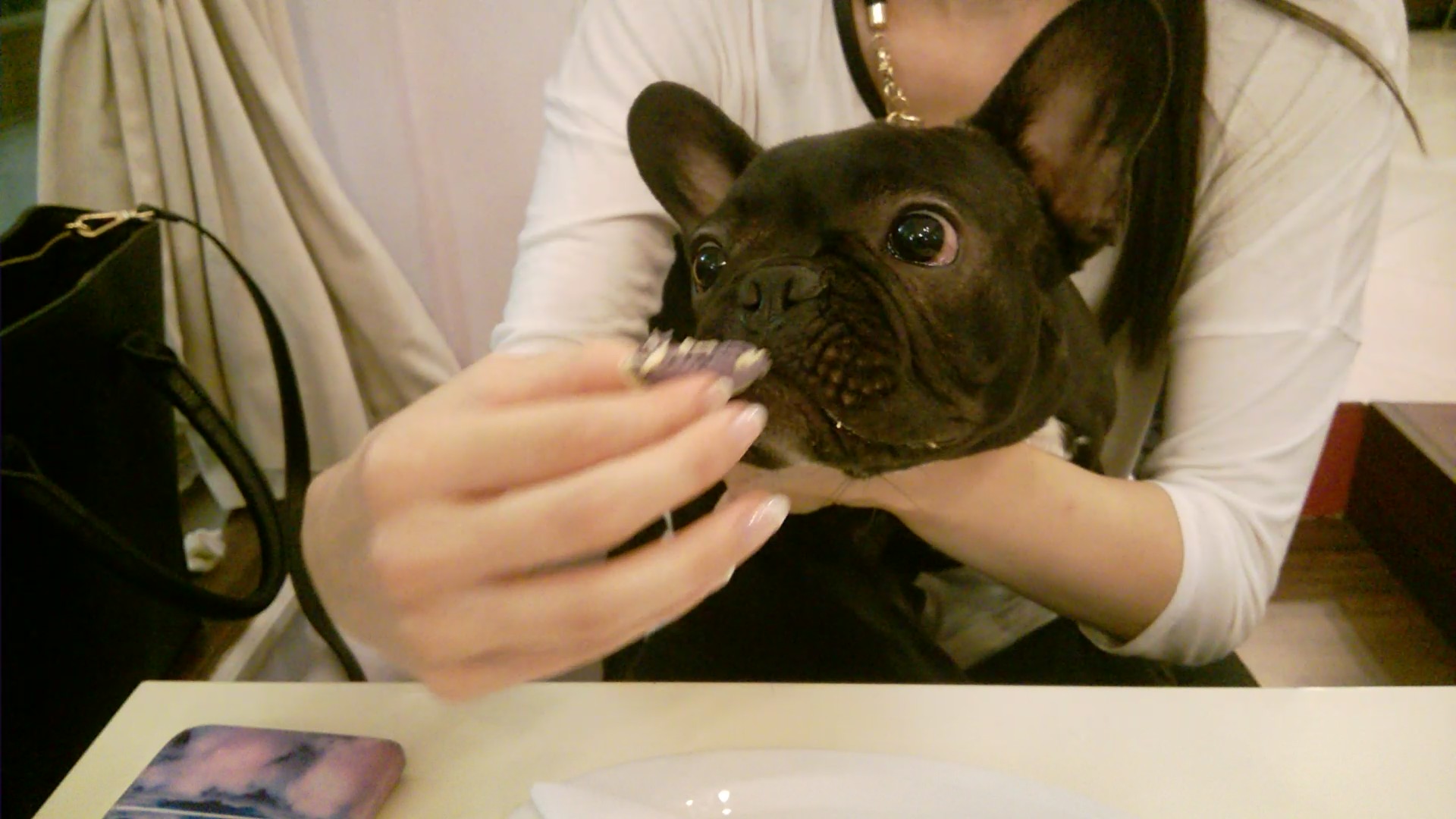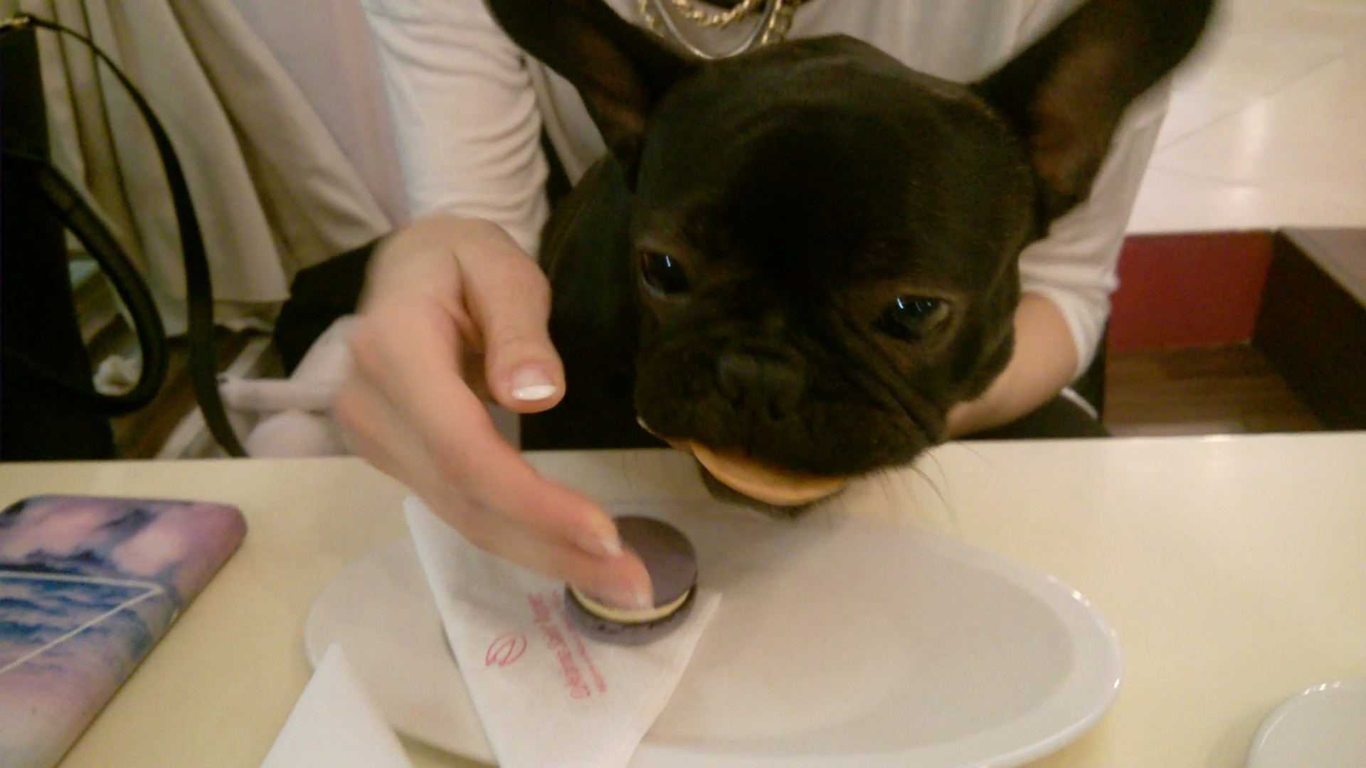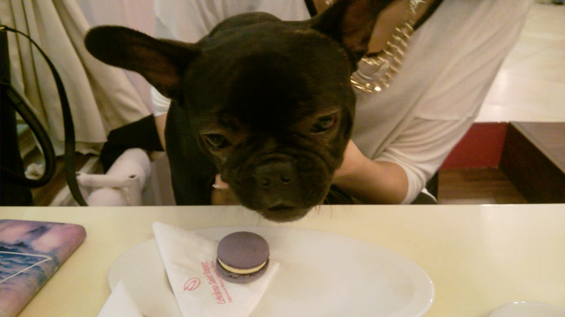 And we were allowed in, and I was even able to come out of my carry-bag and delight some of the guests and staff with my presence. I love people who rub me, cuddle me, and when they smell like a food, that’s when I love them the most. The gentleman from the patisserie even brought me a bowl of water and even though when we were outside I didn’t want to drink (see outside the two bipeds give me a drink from a tasteless blue, collapsible rubber bowl) but from that beautiful porcelain bowl in the patisserie it would be a sin not to drink.